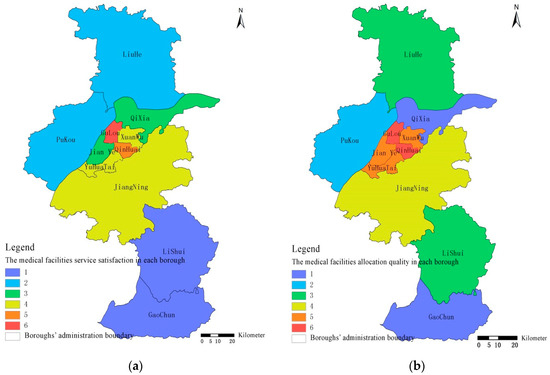 Considering that medical facilities are mainly governed by administrative boroughs in China, we mapped comprehensive service satisfaction to each borough in Nanjing (Figure 10a). We found that the spatial distribution characteristics were higher in downtown areas and lower in peripheral areas. The area with the highest service quality was Gulou borough. Due to the dense distribution of various provincial organs, universities, scientific research institutions, and other social institutions, this borough provides a great deal of employment and has the highest population density. The second is Qinhuai borough, which has a large population and diversified medical facility allocation, followed by Xuanwu, Yuhuatai, Jiangning, Jianye, and Qixia boroughs. It should be noted that service satisfaction levels improved in Pukou and Luhe boroughs. With the official approval of the Nanjing Jiangbei National Development Zone in 2015, the regional development level will be greatly enhanced and the corresponding allocated medical resources will be followed up one after another. Moreover, Lishui and Gaochun boroughs have the lowest service satisfaction levels because of the long distance to downtown and the scarcity of medical resources. With the opening of a high-speed railway, medical services would be more convenient in downtown and suburban areas. Based on the equitable development demands of public service resources, medical resources will radiate actively from downtown areas to the suburbs in the near future.