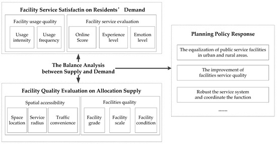 Currently, research on the evaluation of public service facilities in China exists mainly in the fields of planning, geography, and government management. Facility allocation research has made great progress from a beginning of fully accepting foreign theories to consideration of China’s national requirements [49]. For the planning department, urban renewal work focuses more on planning, implementation, and evaluation in the current development stage [50]. To promote functional enhancement and optimization allocation, a more comprehensive evaluation of existing facilities in terms of facility usage and service quality is required. Public service facility planning policies should change from their previous focus by relying on a single land-use population size, block level, and other static indicators to consider the needs of residents and carry out human-oriented planning.