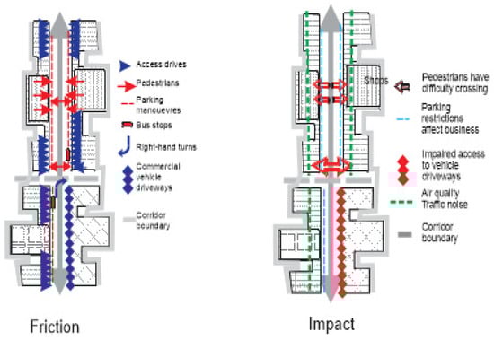 There are different kinds and levels of friction (Figure 2), and—depending on what is to be achieved—friction can be ameliorated or removed entirely. For example, if some of the corridors need major adaptive work because of frontage friction, some of the businesses now dependent on conventional vehicle access may require relocation into another precinct. This in-depth investigation may be an opportunity for innovation by grouping autonomous business vehicles. Workshops with stakeholders and community representatives are obviously needed here, as there is a lot at stake during any transition period.
