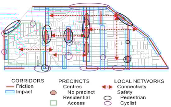 The urban planning perspective is informed by our collective experience in researching and writing guidelines for Australian government agencies. The rationale for these works can be found in the production of system-engineering flow diagrams. We have also given extensive professional consulting advice to all levels of government in Australia in planning new towns and urban areas available only in non-peer reviewed reports. The underpinning principles are the recognition of movement corridors and precincts and the need to analyse friction and impact. There are two fundamental requirements in the development of urban areas: (i) to provide for through movement and (ii) to protect living areas and areas of activity from traffic (called in Australia “rat-running”) and its associated safety and environmental impacts. Traffic calming in residential areas (local area traffic management in Australia) aims to deter through traffic by the implementation of various traffic control devices, thereby encouraging vehicles to take surrounding major or sub-arterial roads. The purpose of this policy tool is to protect local environments from through traffic movements by creating precincts and to ensure there are adjacent road corridors for these traffic movements.
