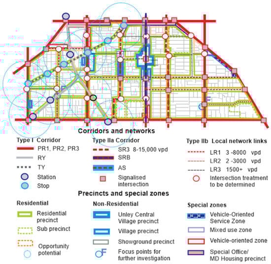 Effectively managing existing road corridors with adjacent mixed-use developments requires a strategy plan for implementation that is best explained with an example. The strategy for the study area of the City of Unley is presented in Figure 4. This work was commissioned before we were aware of the changes in transport technology and the potential of fully autonomous vehicles. The built form remains much the same and therefore the process that we introduce in the next section can be used today for studying the impact of, and transitioning to, autonomous vehicles.