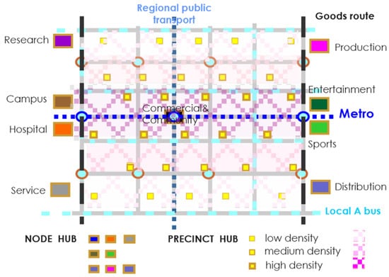 A strategic planning process for precincts (the geographical entity that creates the demand for travel), mobility hubs, and corridors is proposed that involves community engagement through a series of workshops. With the arrival of autonomous vehicles and new forms of transport such as drones or autonomous buses, metros, and ferries, the choice of transport mode changes. The planning process must reflect this change. Noting the uniqueness of precincts in terms of future modes available and the kinds of corridors, existing and planned, the outcome is a revised strategy plan and action plan that integrates AVs into precincts and mobility hubs. There will be hubs of different scales. One conceptual map will illustrate this point about diversity (Figure 6).