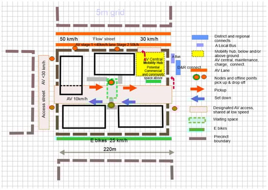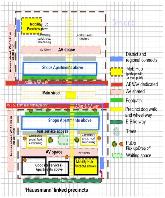 The literature review has demonstrated that, from different disciplinary perspectives, researchers are addressing the challenges associated with new transport technologies and the city, but we have not identified any contributions that focus on land-use planning and the essential building blocks of urban form and function—namely land-use precincts and movement corridors. An exception is the research conducted in precincts in Singapore []. Facilitating seamless transfers through mobility hubs increases public transport use between them, where convenient transfers can be made from an AV to an autonomous bus, railway, or metro, Therefore, people can avoid congested road sections and then transfer to an AV again for the final leg of their journey. This will demonstrably improve the environmental sustainability of cities by reducing private vehicle usage. The precinct mobility hub can serve as a ‘fine grain’ interchange system connected to a larger district and regional transit-oriented hubs. Our view is not one of constant expansion or extravagant urban features but sustainable growth within our long-term capacities, aiming for cities that rely on renewable resources for the long haul, and, significantly, how it is possible to connect with each other—where humans remain in control in an increasingly digitised and AI driven world.