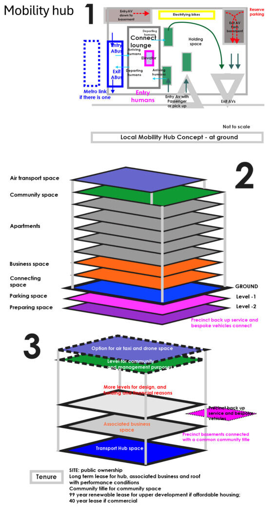 (1) Hypothetical Plan of a Mobility Hub for Autonomous Vehicles; (2) How the Mobility Hub can become a Local Transit-Oriented Development with Autonomous Vehicles; and (3) Tenure Arrangements (Source: H. L. Westerman).