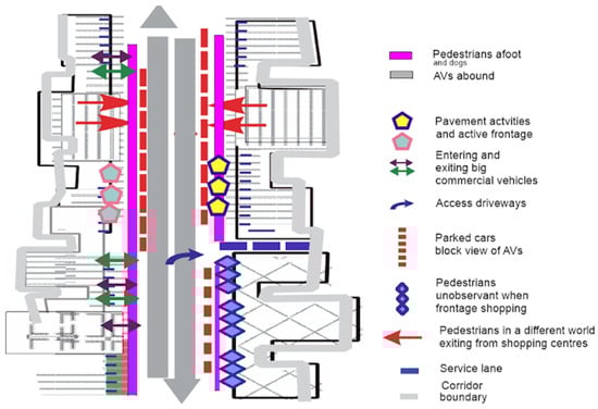 Currently, there is no evidence of an understanding of what it takes to plan land uses in regard to the transition of fully autonomous AVs into the urban fabric. There is not any conceptual agreement on the nature of the transformation of roads and their frontages, precincts, and mobility hubs. Planning options on to how to safely introduce AVs while avoiding risk to the public are yet to be determined. This paper introduces how such modifications to urban spaces can be achieved, with an emphasis on personal fully autonomous vehicles, community-owned AVs, public transport services, and AV taxi services. Road frontages and abutting land-use activities represent a microcosm of the series of issues facing socio-technical systems interacting throughout the city []. This specific microcosm contains unwanted vehicular impacts, such as the intrusion of road traffic noise and harmful vehicle emissions; accidents involving pedestrians, cyclists, and vehicles in the road space; and the unnecessary “friction of land-use activities” that impede the free-flow of vehicles through driveways, parking and un-parking manoeuvres, and pedestrians crossing the road at undesignated places.