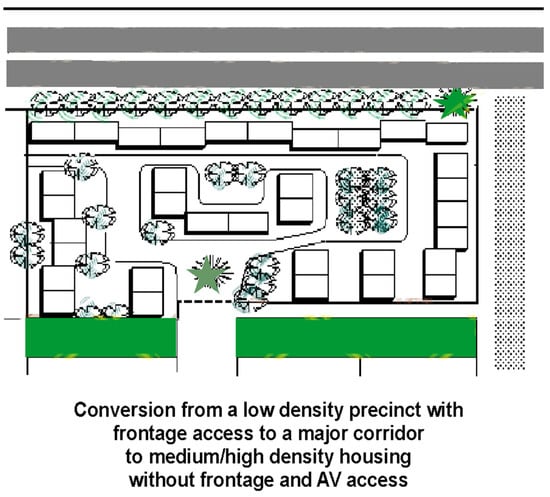 Future readiness means that there is a flexible system plan for land use in place which enables the AVs to start even at a minimal level, with extensions and upgrading being allowed as resources permit. Since precincts vary globally, careful classifications are essential for context. Investigating corridor profiles on friction and impact is crucial, as they establish the rules for AV performance. Areas for priority intervention will be identified, an interim management plan can be put in place, and options can be discussed with the local community and businesses. Successful adaptation and transformation require collaboration among property owners, developers, and government agencies. Model rules and design guidelines will be necessary, adapting to future research and development. All this will take time, but it presents an opportunity to rethink the quality and presentation of precinct areas, which have changed from their original character. Transitions take place over long periods of time, so the risk management framework must be embedded within agile government [], with its continuous cycle of readjusting goals, objectives, policies, and programs against system performance indicators. To make this land-use planning process clearer, we have provided examples on the suburban scale and the precinct level of a city and its movement corridors, noting, of course, that each precinct has its own distinctive context with its own movement corridors (classified into three types).