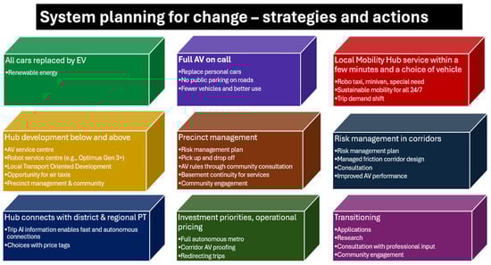 The previous section has explained the methodology of deploying “friction and impact” in the analysis of road corridors and the important mapping of those issues that have been identified. Based on such findings, the problem to address is how AVs will fit into these road corridors, frontage land uses, and precincts. Section 2.4 has identified some of the risk factors to consider and some of the risk management tools. In applying the methodology, it is necessary to formulate a strategy plan for implementation, and this is illustrated for the City of Unley. During our deliberations on this matter, it became apparent that the new concept of a mobility hub was essential in order to successfully transition AVs into precincts so as to achieve their potential in complementing public transport services. Section 3.2 elaborates on this future new type of land use. Planning strategies and mobility hubs require a vision, actions, and options (Section 3.3). Finally, several examples of suburbs, precincts, and movement corridors are given.