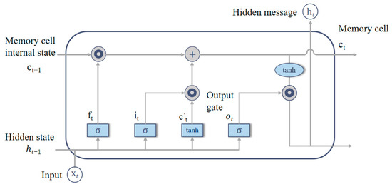 LSTM was proposed by Hochreiter and Schmidhuber in 1997, and it is a variant of RNN network [33]. RNN is widely employed in time series prediction due to its ability to capture time dependencies. Compared to RNN, LSTM mitigates the issue of “gradient vanishing” caused by backpropagation during model training and exhibits long-term dependency learning capabilities, making it more suitable for processing traffic flow data. The schematic diagram of an LSTM network is depicted in Figure 1.