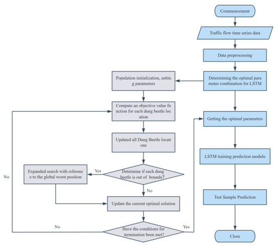Given the limited prediction accuracy and robustness of traditional statistical models, such as Kalman filter, gray scale prediction, and Markov chain, which render them inadequate for real-time ship traffic control due to the inherent challenges in solving nonlinear relationships, this paper adopts the deep learning method within the domain of machine learning prediction. However, while deep learning algorithms primarily focus on data decomposition to improve accuracy, the combination of hyperparameters in deep learning networks significantly affects the prediction results. Given the challenge of determining appropriate parameter combinations for diverse research data, multiple iterations for debugging become imperative. Therefore, the use of intelligent optimization algorithms to iteratively explore optimal parameter combinations in deep learning networks is crucial for improving prediction accuracy. As a result, an intelligent optimization algorithm is essential to iteratively fine-tune parameter combinations within deep learning networks to improve prediction accuracy. Zhang et al. used the adaptive particle swarm optimization (SAPSO) algorithm to adjust the structural parameters of the back-propagation neural network (BP) and proposed an improved PSO-BP model, called SAPSO-BP model, for the analysis and prediction of vessel traffic flow. The BP model, called the SAPSO-BP model, is used for the analysis and prediction of vessel traffic flow, and the experimental results show that this model outperforms the traditional other commonly used prediction models in the prediction of vessel traffic flow [30]. Qing, through experiments comparing the Griewank test function solving, found that the Dung Beetle Optimizer (DBO) algorithm has significant advantages over the Genetic Algorithm (GA), PSO, and Sparrow Search Algorithm (SSA) in terms of convergence speed, global optimum search, and optimization stability [31]. In this paper, an LSTM model optimized on the basis of the DBO algorithm is proposed and elaborated specifically for short-term ship traffic flow prediction. This combination is not only a simple integration of existing prediction methods, but also accurately optimizes the hyperparameters of the LSTM model through the efficient search capability of the DBO algorithm, thus significantly improving the prediction performance of the model, which has not been widely applied or thoroughly investigated in previous studies. Compared with the existing prediction models, we not only introduce DBO-LSTM to the task of ship traffic flow prediction, but more importantly, we precisely optimize the hyperparameters of LSTM by the DBO algorithm, which significantly improves the prediction accuracy and practicality, and at the same time provides important theoretical support and application value for port management and related decision making. The paper is organized as follows: Section 2 presents the theoretical foundations of the DBO algorithm and the LSTM model, as well as the construction of the combined model. Section 3 discusses the experiments and analyses performed. Finally, Section 4 presents the conclusion of the paper.