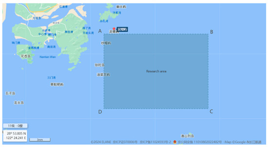 In this paper, the data are adopted from the AIS data of Xiangshan Port of Ningbo Maritime Bureau from 1 February 2023 to 29 April 2023, and the delineated study area is a rectangle with the latitude and longitude of its four vertices as A (122.0246° E, 29.1253° N), B (122.3079° E, 29.1253° N), C (122.3079° E. 28.9481° N), D (122.0246° E, 28.9481° N), and the region is shown in Figure 3.