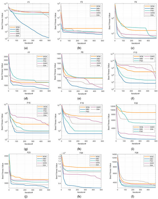 Comparison of convergence of various algorithms: (a) solve for the convergence of the F1 function; (b) solve for the convergence of the F3 function; (c) solve for the convergence of the F4 function; (d) solve for the convergence of the F7 function; (e) solve for the convergence of the F8 function; (f) solve for the convergence of the F13 function; (g) solve for the convergence of the F15 function; (h) solve for the convergence of the F19 function; (i) solve for the convergence of the F22 function; (j) solve for the convergence of the F23 function; (k) solve for the convergence of the F26 function; (l) solve for the convergence of the F28 function.