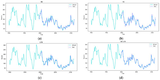 Prediction results of traffic flow: (a) demonstrating the RNN model to predict traffic flow; (b) demonstrating the TCN model to predict traffic flow; (c) demonstrating the LSTM model to predict traffic flow; (d) demonstrating the DBO-LSTM model to predict traffic flow.