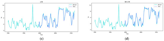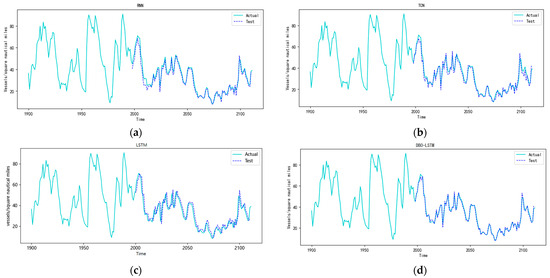 In order to illustrate the prediction accuracy of the DBO-LSTM model more clearly, this paper introduces three error evaluation indexes, namely, mean absolute error (MAE), root mean square error (RMSE), and mean relative error (MRE), which are convenient for objectively evaluating the prediction effect of the prediction model. Their calculation formulas are shown in Equations (24)–(26), respectively.