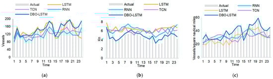 The results of the proposed DBO-LSTM model for predicting each traffic flow parameter are visualized as shown in Figure 6, Figure 7 and Figure 8. From the figure, it can be seen that the DBO-LSTM model can reflect the volatility of the data well, and its prediction fits the real value to a high degree, which can reflect the change in vessel traffic flow more realistically.