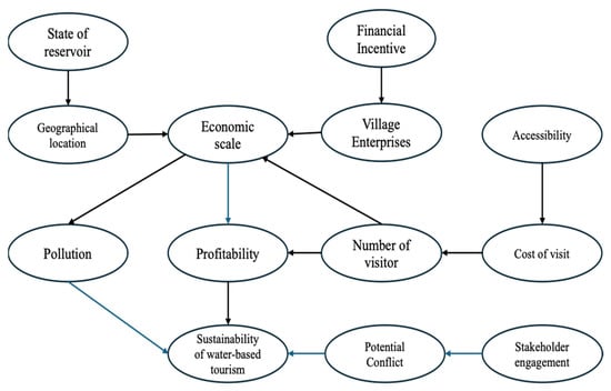 The interconnection between variables can be outlined as follows. The sustainability of water-based tourism is influenced by a range of factors, both directly and indirectly. Primarily, the profitability of the business is a key consideration for business operators (such as small cafes, boat rentals, and restaurants). However, this factor is impacted by the number of visitors and the economic scale, whether low or medium. The number of visitors is contingent on the cost of the visit and the accessibility of the location. On the other hand, the economic scale of the business is determined by the geographical location and the level of enterprise ownership, whether village-owned or not.