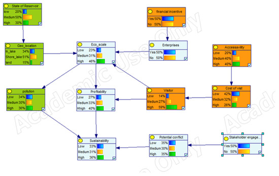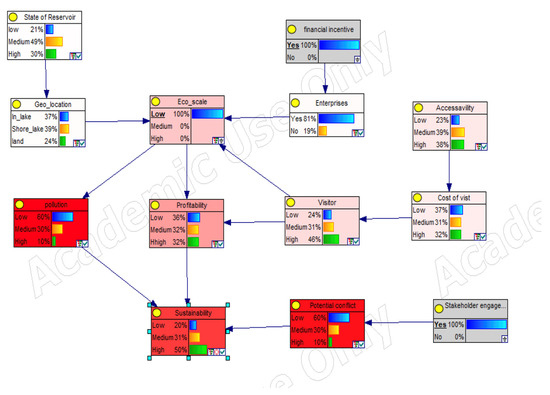 The structure of BN of prior probabilities for the sustainability of water-based village tourism can be seen in Figure 6. As can be seen from Figure 6, with the current value of CPT obtained from stakeholder elicitation, using a 50:50 change of financial incentive and 50:50 chance of stakeholder engagement as implementing nodes, the level of sustainability of water-based tourism is approximately 36% high.