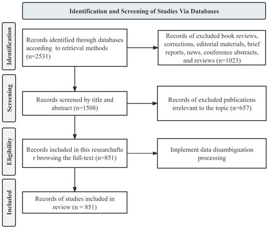 The dataset for this study was constructed based on precise sources of data, search strategies, data processing techniques, and tools [32]. The WoS database was chosen as the primary data source due to its extensive database access and comprehensive information, facilitating bibliometric analysis, hence its widespread use in bibliometrics [36,37,38]. The data for this study include information from the SCI-Expanded and the SSCI within WoS. To ensure extensive data coverage, the study employed a specialized search expression. Additionally, the following criteria were set to filter preliminary data: (1) the literature search range was set from January 2004 to April 2024, with a cutoff date of April 19; (2) the document type was limited to “articles” to ensure that the selected literature underwent rigorous peer review [32]; and (3) the language of the documents was restricted to English to ensure the universality of the study. Based on these search conditions, a total of 2531 preliminary documents were retrieved. The initial screening results of the related data are shown in Table 1.
