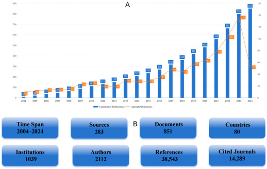 Figure 2B presents additional relevant statistical information, including the time period, number of publications, countries, institutions, number of authors, and citation data. Through the analysis of basic data using VOSviewer for selected literature, we identified 851 publications involving 1039 research institutions from 80 countries and regions, authored by 2112 authors. These publications appeared in 283 different journals and cited 38,543 references from 14,289 journals.