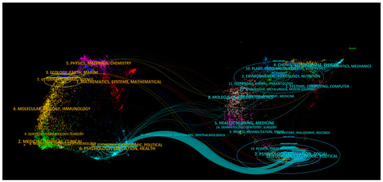 The discipline composition, including the fundamental concepts and principles of scientific knowledge, not only forms the basis of academic fields but also shapes the knowledge background of researchers. Analyzing the foundational disciplines can elucidate the intrinsic connections between different fields and the developmental trends of research topics. This paper reviews the disciplinary distribution of collected papers and their references, exploring the primary disciplines focused upon in the current research area and revealing its disciplinary foundations. Using CiteSpace software’s “dual-overlay mapping” feature, a diagram illustrating the thematic co-occurrence network has been generated, as detailed in Figure 3. This analysis provides deep insights into the disciplinary structure and interdisciplinarity of the research field.
