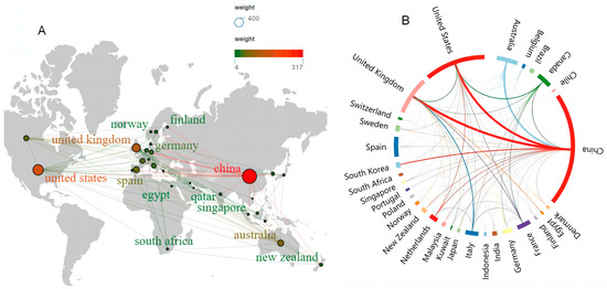 (A) Geographical representation of country/region collaborations. (B) Chord diagram of publication volumes and collaboration networks by country.