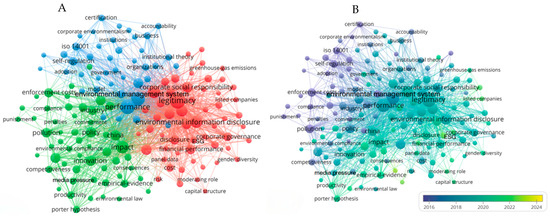 Figure 5A depicting the keyword co-occurrence analysis, reveals three main clusters. The red cluster focuses on EID and “sustainable development”, exploring the relationship between corporate transparency in environmental information and green sustainable growth. The core keyword in the green cluster is “innovation”, specifically pointing to “Green technology innovation”, a concept that involves improvements in corporate products and processes to minimize environmental impact [52]. The blue cluster centers around “environmental management system” and “performance”, emphasizing the analysis of how internal environmental compliance affects corporate performance. These clusters clearly define the key research themes and directions within the field of corporate environmental compliance.