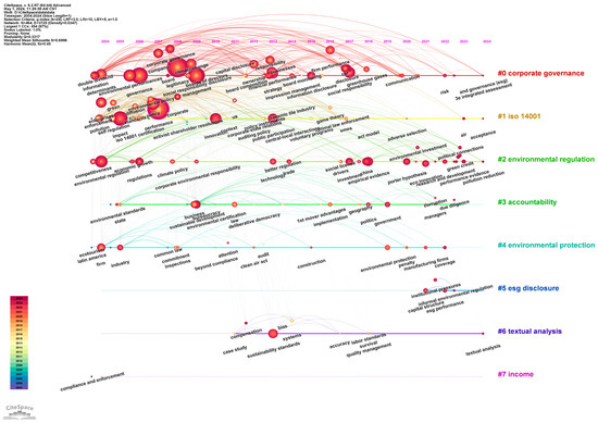 To further explore the evolution of research in corporate environmental compliance, this section utilizes CiteSpace’s timeline feature to conduct a visual mapping analysis of keywords. Figure 6 displays the seven main clusters and their distribution of keywords by year. The clusters are numbered based on the quantity of keywords they contain, with a lower cluster number indicating a higher number of keywords. Additionally, the display of keywords employs a tree ring format, where the diameter of the rings visually indicates the occurrence rate of each keyword, and the varying shades of the rings reveal the research popularity of the keywords in different years. This visualization method not only clearly marks the importance of each keyword but also provides an in-depth view of the changes in popularity of these keywords over time, offering an intuitive perspective for understanding the development trends within this research field.