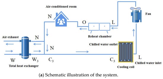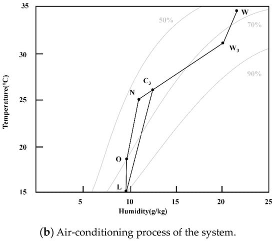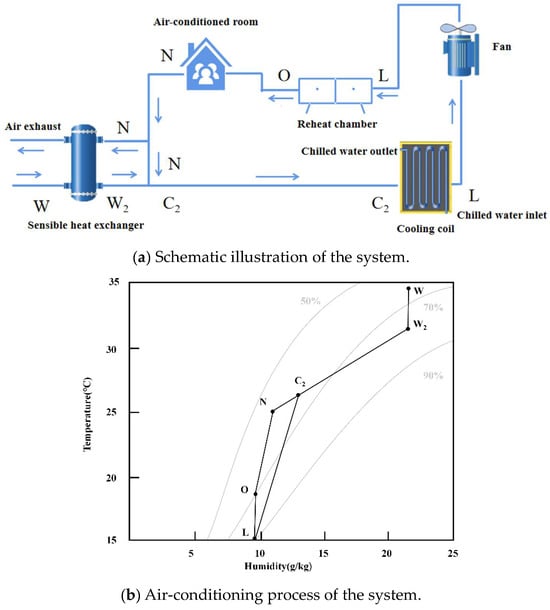Air-conditioning systems are mainly used to control the temperature and humidity of indoor air []. In a conventional central air-conditioning system, the chilled water (at 7 °C) from central chillers is widely used to cool and dehumidify the indoor air [,]. The cooled air at low temperatures cannot be supplied to the room directly because the feeling of cold wind is uncomfortable for people []. It should be reheated to the required air supply state by the external energy, which leads to lower energy performance in a conventional central air-conditioning system []. The cooling and reheating energy consumed in central air-conditioning systems has a great potential to be saved through some new technologies. For instance, liquid-desiccant dehumidification technology has received growing interest in recent years [] because it does not require a low-temperature cooling source to dehumidify the air and then avoid the following reheating process []. Concurrently, various energy-recovery devices have been employed to save energy in central air-conditioning systems. The exhaust air can pre-cool the entered fresh air through the energy-recovery facility []. In addition, optimization operation control is also an effective method of energy saving in central air-conditioning systems, and this has been studied by researchers [].