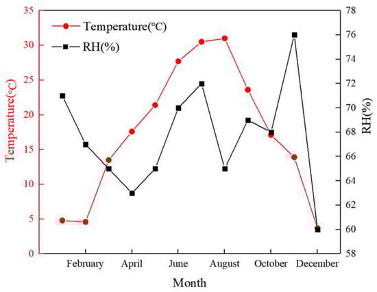 The monthly average outdoor temperature and relative humidity in Nanjing throughout the year.