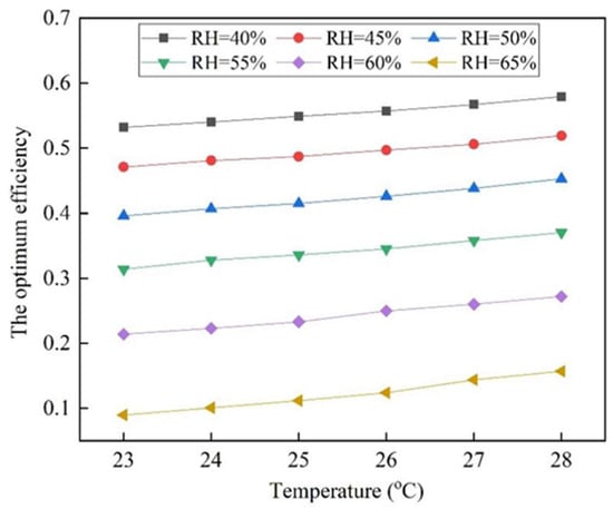 The optimum efficiency of internal heat exchanger with various outdoor states (tid: 25 °C, RHid: 55%).
