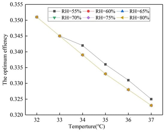 The optimum efficiency of internal heat exchanger with various indoor states (tod: 34.8 °C, RHod: 61%).