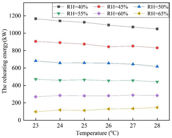 During the operation of a conventional central air-conditioning system, reheating is one of the main sources of energy consumption. Concurrently, the same amount of cooling energy originally used in the cooling process of the supply air is offset and wasted. Therefore, the amount of reheating energy can directly reveal the energy-saving potential of the new system proposed in the paper. Figure 9 delineates the influence on the reheating energy of various indoor design parameters under typical summer conditions in the Nanjing area. As can be seen from Figure 9, an increase in indoor design RH can obviously lead to a decrease in reheating energy. In addition, the influence of indoor design temperature on the reheat energy is much less than that of indoor design RH. This phenomenon indicates that the proposed new system will demonstrate an increasing number of energy-saving advantages over the conventional system with a decrease in the indoor design RH. The reheating energy of the system is the same under various outdoor conditions due to the constant state points of supply air and apparatus dewpoint.
