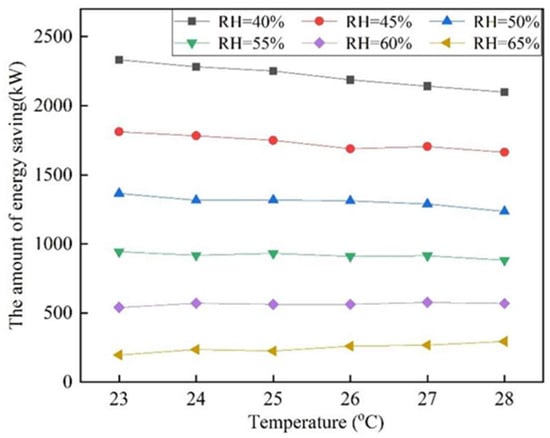 Figure 10 shows the energy-saving amount of the new system with various indoor design parameters. The amount of energy saving obviously increases with the decrease of indoor design RH, and the influence of indoor design RH on the amount of energy saving is much greater than that of indoor design temperature. For instance, the energy-saving amount rises from 196.306 kW to 2332.51 kW when the indoor design RH is from 65% to 40% and the indoor design temperature is 23 °C. When the indoor design temperature is from 23 °C to 28 °C and the indoor design RH is 65%, the energy-saving amount rises from 196.306 kW to 294.206 kW. Therefore, the energy-saving amount varies between 196.306 kW and 2332.51 kW with the change in indoor design parameters. Compared to the conventional system, the energy saved by the new system includes two parts: the reheating energy and the same amount of cooling energy offset by the reheating energy. According to the law of energy conservation, the new system can save twice as much energy as the reheating energy of the conventional system. Therefore, the variation trend of the energy-saving amount is basically the same as that of reheating energy with the change in indoor design temperature and RH. The energy-saving amount of the studied new system with various outdoor design parameters is constant.