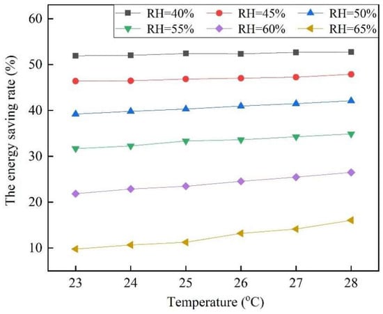 Figure 11 depicts the effect of the indoor design temperature and RH on the energy-saving rate of the proposed new system. It can be found that the increase in the design temperature and the decrease in the design RH can promote the energy-saving rate. However, the influence of RH is much greater than that of temperature. For instance, the energy-saving rate rises from 9.07% to 51.92% when the indoor design RH is from 65% to 40% and the indoor design temperature is 23 °C. When the indoor design temperature is from 23 °C to 28 °C and the indoor design RH is 65%, the energy-saving rate rises from 9.07% to 16.04%. Therefore, the energy-saving rate varies between 9.07% and 52.74% with the change in indoor design parameters.