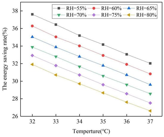 Figure 12 describes the effect of the outdoor design temperature and RH on the energy-saving rate of the proposed new system. The trend of the energy-saving rate under different outdoor design temperatures is opposite to that under different indoor temperatures, and the energy-saving rate increases with the decrease of outdoor design RH. This is because the reheating energy of the new system does not vary with the outdoor design temperature and RH, but the total energy consumption of the air-conditioning system increases due to the increase of outdoor design temperature and RH. Therefore, the energy-saving rate of the new system decreases with the increase in outdoor design temperature and RH. This indicates that the energy efficiency of the proposed new system will be improved with the decrease in the outdoor design RH and temperature.