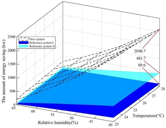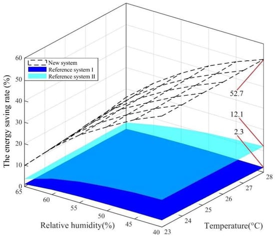 In the paper, two reference systems are chosen to compare the energy-saving effect with the proposed new system. During the calculation, the heat exchanger efficiencies of the three heat exchangers (i.e., the internal heat exchanger, the sensible heat exchanger, and the total heat exchanger) are kept the same as a benchmark of comparison. The energy-saving amounts and rates of the three systems with various indoor states are shown in Figure 13 and Figure 14, respectively. As is obvious, the energy-saving effect of the new system is much higher than that of the two reference systems. The difference in energy-saving effect between the new system and the reference systems increases rapidly with the decrease of indoor design RH. For the maximum amount of energy saving under the study conditions, the new system can reach 2098.7 kW, which is many times the number of reference systems (in particular, Reference System I), as shown in Figure 13. Correspondingly, the maximum energy-saving rate of the new system is up to 52.7% when the indoor design temperature and relative humidity are 28 °C and 40%, respectively. However, under the same condition, the values of the two reference systems are only 12.1% and 2.3%, as shown in Figure 14.