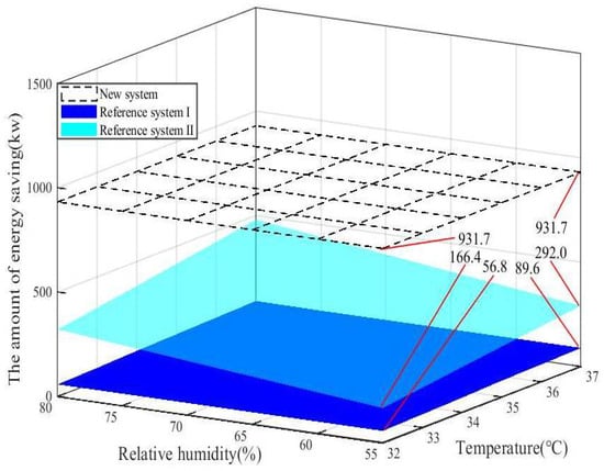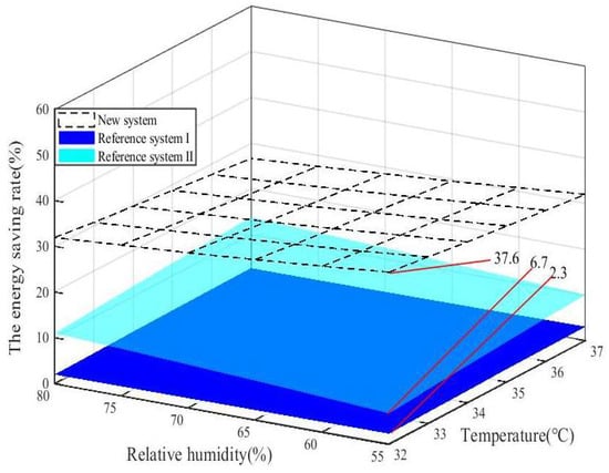 Figure 15 and Figure 16 show the energy-saving amounts and rates of the three systems with various outdoor states, respectively. Similarly, the energy-saving effect of the new system is much higher than that of the two reference systems. The difference in energy efficiency increases with the decrease in outdoor design temperature between the proposed system and the two reference systems. For instance, when the outdoor design RH is 55%, and the outdoor design temperature is from 32 °C to 37 °C, the energy-saving amounts of the proposed system are 16.4 to 10.4 times higher than that of the Reference System I; and 5.6 to 3.2 times higher than that of the Reference System II, as shown in Figure 15. Under the studied conditions, the maximum energy-saving rate of the new system is up to 37.6% when the outdoor design temperature and RH are 32 °C and 55%, respectively. By contrast, the values of the other two systems are only 6.7% and 2.3% under the same condition, which is shown in Figure 16.