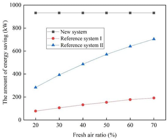 In the new system, the internal heat exchanger can handle all the supply air while the sensible heat exchanger and total heat exchanger can only pre-cool the fresh air. Therefore, the fresh-air volume is one of the main factors affecting the energy-saving effect of the three studied systems. In the above study, the minimum fresh-air volume (the fresh-air ratio is about 20%) based on the number of people in the room is adopted, which leads to the obvious difference in the energy-saving effect between the new system and the two reference systems. With the improvement in the living standards of ordinary people and the COVID-19 pandemic, the fresh-air ratio of the central air-conditioning system is recommended to be increased, and recirculated air is even required to be avoided in enclosed areas []. Predictably, an increase in the fresh-air ratio can narrow the difference in the energy-saving effect of the three studied systems. Figure 17 and Figure 18, respectively, illustrate the energy-saving amounts and rates of the three systems with various fresh-air ratios under specific design conditions shown in Table 3.