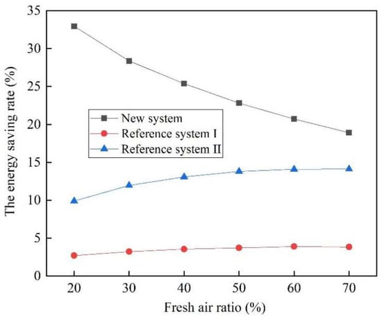 From Figure 17, it is clear that an increase in the fresh-air ratio can effectively increase the energy-saving amount of the two reference systems (in particular, Reference System II). During the calculation, the mass flow of supply air and the state parameter of each point is kept constant, which results in the constant value of the energy-saving amount in the new system. It is universally acknowledged that the increase in fresh-air ratio can lead to a higher cooling load of the central air-conditioning system. Therefore, the energy-saving rate of the new system continues to decline with the increase in the fresh-air ratio. Even so, the new system still has obvious energy-saving advantages compared to reference systems. As can be seen from Figure 18, the difference in energy-saving rates between the new system and Reference System II (Reference System I) ranges from 5% to 23% (15% to 30%), with a decrease in fresh-air ratio from 70% to 20%. This means that when the minimum fresh-air volume is satisfied in the building, the reduction of the fresh-air ratio can significantly improve the energy efficiency of the new system. Compared to the two reference systems, it is obvious that the new system has greater energy-saving potential.