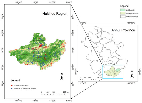 The study area is the Huizhou region (Figure 1). The Huizhou region is the predecessor of the present-day Huangshan City, with Huizhou as its prototype, and also includes some of the neighboring pan-Huizhou regions and is located in the combination of Anhui, Zhejiang, and Gan provinces [42]. The traditional Huizhou region refers to the ancient Huizhou area consisting of Taiping County, Shexian County, Xiuning, Wuyuan, Qimen, Yixian County, and Jixi. Its administrative map is relatively stable, with Wuyuan belonging to Jiangxi Province and the rest of the region belonging to Anhui Province. As the seat of ancient Huizhou, the local area has many historical figures and celebrities through the ages, and the history and culture are very developed. Zhu Xi, Cheng Minzheng, Dai Zhen, Tao Xingzhi, and so on are historical celebrities who have had important influence in various fields. Huizhou culture consists of economic and cultural genres such as Xin’an Science, Xin’an Medicine, Anhui Opera, Hui Printmaking, Hui Seal Engraving, Hui Bonsai, etc., which are profound and have a long history [43]. Huizhou District is located in the central part of Huangshan City. Its Fengle River is the “mother river” of Huizhou District and belongs to the subtropical monsoon humid climate zone; the average rainfall for many years is 1728.2 mm, but the inter-annual distribution of uneven, spring rainy, rainy, autumn drought, winter rainfall [44]. The region has seven counties and two cities under its jurisdiction, with a total area of 1.34 million square kilometers and a total population of 1.79 million. The administrative office was initially located in Shexian County and later moved to Tunxi, which is geographically located between longitude 118°04′10″–118°53′50″ E and latitude 29°30′25″–30°09′10″ N. The region has a unique historical background and rich historical and cultural relics, and there are many traditional ancient villages representing Huizhou [45], immersing tourists in the unique historical atmosphere of Huizhou and making Huizhou a popular tourist region today.