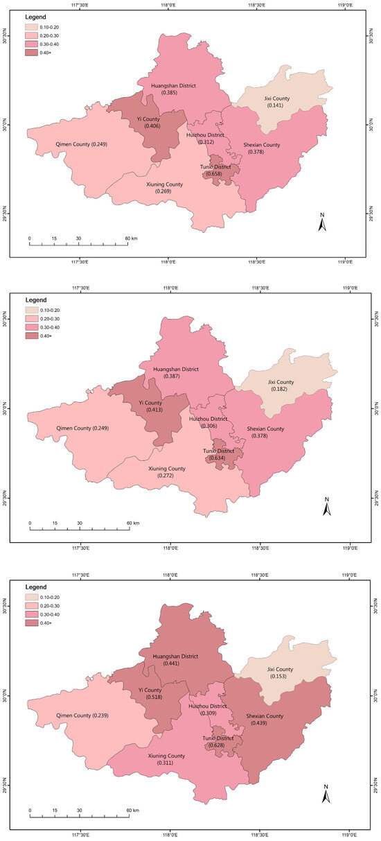 Three districts and counties, Tunxi District (H1), Yixian County (H6), and Huangshan District (H3), are at the top of the score value of tourism development level in Huizhou. Most of the popular scenic spots in Huizhou are located in Tunxi District and Huangshan District, which has a location advantage. Moreover, as the central urban area with the highest level of economic development in Huangshan City, Tunxi District does not have a high dependence on tourism compared to other districts and counties. However, Tunxi District has more commercial and recreational facilities, which attract a large number of passengers and greatly promote the development and upgrading of the tourism industry in Huizhou. Yixian County’s public service quality indicators are not excellent, but each of them is in the middle and upper levels of the Huizhou region, with a good balance. There is not much difference with Tunxi District, thanks to Yixian County’s superiority of its natural environment and the richness of tourism. According to statistical data, Yixian County has 22 A-level scenic spots as of 2021, including two 5A-level scenic spots, which is far more than other districts and counties in Huizhou region, and 81 intangible cultural heritages, which accounts for the largest proportion of intangible cultural heritages in Huizhou region. It can be seen that the quality of cultural services has a greater impact on the tourism industry in Huizhou, and Yixian County has given full play to the many local tourist attractions and unique regional culture and has gained an advantage in the local tourism industry, which in turn has led to the development of the local economy in Yixian County. Huangshan District occupies the largest area in the whole Huizhou region, and Huangshan County is not ranked at the top of all indicators, but it is in the middle and upper level in the Huangzhou region, and it is well-balanced.