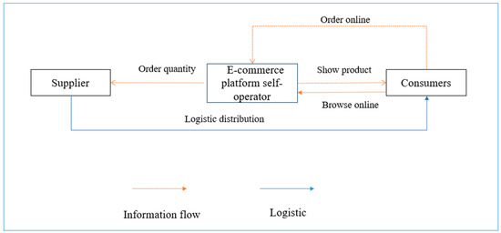 Using electronic products as a case study, this paper investigates the decision-making processes within a dual-entity e-commerce supply chain, consisting of a supplier and an e-commerce platform self-operator. In this supply chain, the supplier is tasked with manufacturing electronic products and providing them to the e-commerce platform’s self-dealer at wholesale prices. The e-commerce platform self-operator orders these electronic products from the supplier and sells them online to consumers. Additionally, the supplier determines the product’s wholesale price and quality level , while the self-operator of the e-commerce platform determines the market sales price and marketing efforts . The structure of the model is shown in Figure 1.