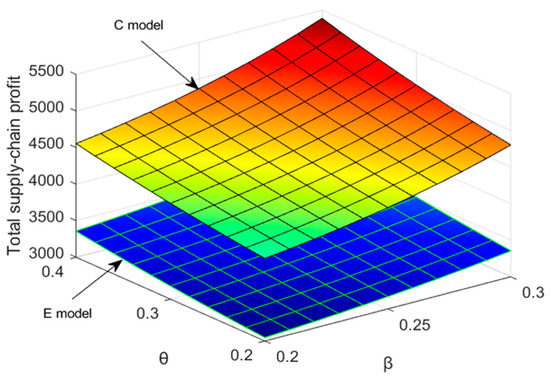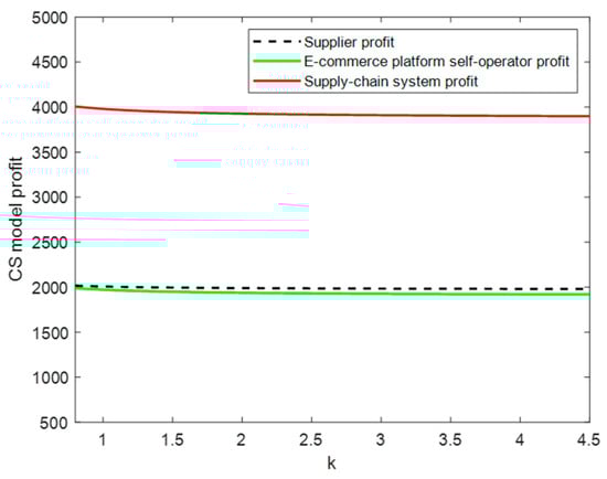 Proposition 1 indicates that within a decentralized decision-making framework, the supplier’s profit is higher when the supplier assumes a leadership role, as opposed to when the e-commerce platform self-operator holds the leadership position. Furthermore, the supplier’s profit is higher than that of the e-commerce platform self-operator. Conversely, when the e-commerce platform self-operator is in a leadership position, the results are reversed. This illustrates that when the supplier occupies a leadership position, they can more effectively manage production, costs, and the supply chain. Consequently, they can sell products at higher prices and attain greater profits. On the other hand, when the e-commerce platform self-operator holds the leadership position, they can achieve higher sales and profits through a deeper understanding of market demand and by meeting consumer needs with precise positioning and innovative marketing strategies. Furthermore, the total profit of the supply-chain system is higher under centralized decision making compared to decentralized decision making. This implies that substantial room for improvement exists within decentralized decision making, primarily due to the impact of double marginalization.