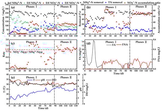 Effect of nitrogen removal in the reactor: (a) nitrogen conversion; (b) nitrogen removal and nitrite nitrogen accumulation; (c) changes in T, pH, DO; (d) changes in the concentration of FA and free nitrite; (e) effluent NH4+-N/NO2−-N values.