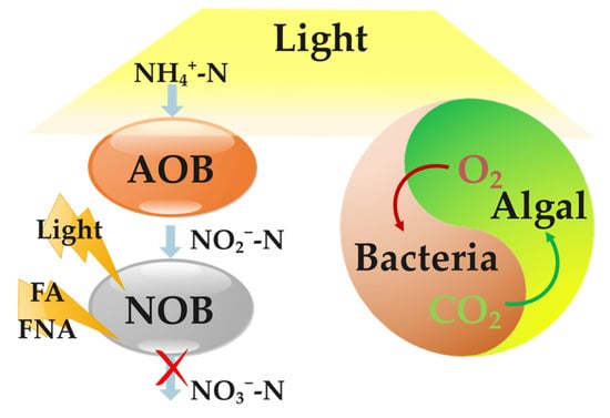 Researchers have found that light can inhibit the activity of both AOB and NOB, although AOB demonstrate a stronger tolerance [17,18]. Si et al. positioned a blue light source with an intensity of 200 μmol/(m2·s) 10 cm outside a transparent organic glass PSBR reactor, resulting in the NAR increasing from 0% to over 90% within just 15 days, and stabilizing at approximately 88.5% [19]. Arun et al. exposed microorganisms to varying intensities of light and observed that light at 150 and 500 μmol/(m2·s) inhibited NOB activity, leading to the accumulation of NO2−-N. At higher intensities of 1500 and 2000 μmol/(m2·s), both AOB and NOB were inhibited, with ARE dropping to 6.2% and −2.2%, respectively [20]. Introducing a 2 L transparent sequencing batch reactor to sunlight with an average intensity of 1531 μmol/(m2·s) resulted in rapid nitrite accumulation after 15 days [21]. Kang et al. demonstrated that light at 500 and 1000 μmol/(m2·s) could selectively inhibit NOB [22]. As light intensity increases, significant algal growth tends to transform the activated sludge system into an algal-bacterial consortium [21,23,24]. Some studies have directly added maturely cultured algae to reactors to establish an algal-bacterial consortium [25]. In these consortia, algae absorb CO2 produced by microorganisms and produce O2, replacing traditional aeration methods and reducing energy consumption [26,27]. Moreover, algae can assimilate nitrogen [28]. Vergara et al. found that algae growth can mitigate the inhibitory effects of light on microorganisms to some extent [29].