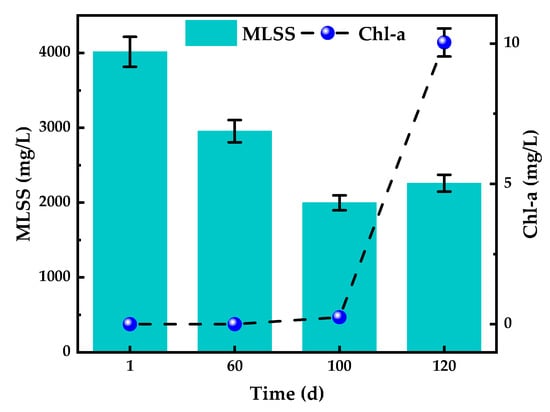 TN removal in the algal-bacterial granular sludge system largely depends on denitrification [39], as anoxic and anaerobic zones form within the granular sludge. Studies have shown that providing a certain intensity of light to the bacterial-algal symbiotic system can improve TN removal. Algal biomass and activity increase with light intensity, and nitrogen is assimilated by algae [40]. In this study, nitrogen was primarily removed by microorganisms, partly because of the low algal biomass, as indicated in Figure 3. The nitrogen removal capacity was limited, and no algal cultures were added during the reaction period to achieve partial nitrification. Initially, Chl-a was 0 mg/L, increasing to 10.04 mg/L after 32 days of light exposure. Moreover, the retention time of sludge in the RBC was short, leading to weaker algal assimilation. Rada-Ariza et al. found that with a decrease in SRT, the nitrogen removal effectiveness of the algal-bacteria consortia decreased, primarily due to reduced algal assimilation and reliance on nitrification/denitrification [41]. The TN removal efficiency sharply dropped to −3.12% by Day 89 and further to −16.15% by Day 93. It then slightly improved and eventually stabilized at −5.79%. This decline was likely due to damage from high-intensity light, which inhibited microbial activity and led to bacterial autolysis. The organic matter constituting the bacteria was released and decomposed into organic nitrogen by heterotrophic bacteria [42].