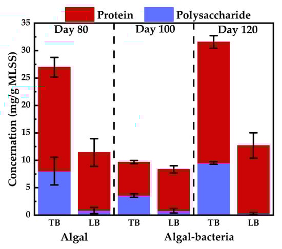 The impact of light on EPS secretion is depicted in Figure 6. After the second phase of illumination, the total EPS content initially decreased and then increased. Between days 80 and 100, the content of LB-PN and TB-PN decreased by 2.74 and 12.57 mg/gMLSS, respectively, while the content of LB-PS and TB-PS decreased by 0.04 and 4.44 mg/gMLSS, respectively. Comparing days 80 and 120, the content of LB-PN and TB-PN increased by 1.93 and 3.20 mg/gMLSS, respectively, the content of LB-PS decreased by 0.43 mg/gMLSS, and the content of TB-PS increased by 1.48 mg/gMLSS. The lower EPS content on day 100 (Phase II) may be attributed to the significant microbial deaths caused by light exposure. However, as the operation continued, microbial growth and reproduction led to an increase in EPS content, surpassing that of Phase I (Day 80). Li et al. found that intermittent aeration and hydraulic shear could promote the secretion of cell EPS, while continuous hydraulic shear could accelerate the dissolution of microbial particles, thereby reducing EPS content [44]. The continuous rotation of the disc also removes CO2 from the water, leading to competition for carbon sources between algae and microorganisms [45].