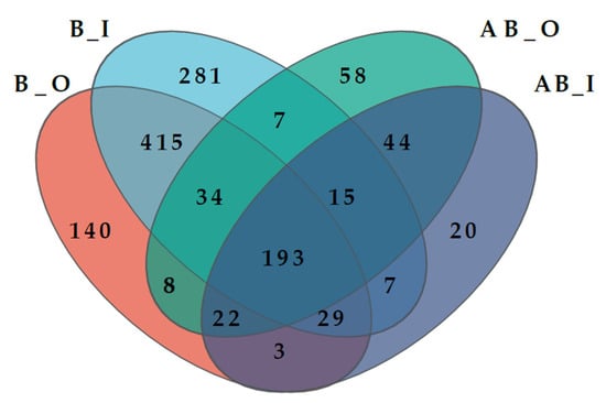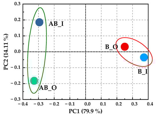 The Ace and Chao indices, which indicate the richness of the microbial community within the reactor, showed a positive correlation with bacterial richness—the higher the value, the greater the species richness in the sample [48]. Conversely, the Shannon and Simpson indices reflect microbial diversity, with the Shannon index positively correlated with species diversity and the Simpson index inversely related [49]. The diversity indices for each sample are presented in Table 3. Under light conditions, the Ace and Chao values for AB_O and AB_I decreased more significantly than those for B_O and B_I without light, with a maximum difference of 621. Additionally, the Shannon index was lower under light conditions, whereas the Simpson index showed the opposite trend. These indices collectively indicate that the introduction of light reduced the richness and diversity of the microbial community in the disc biofilm, accompanied by a significant reduction in operational taxonomic units (OTUs), as shown in Figure 7. This reduction may be attributed to the strong light inhibiting certain microorganisms, resulting in extensive microbial mortality. This observation is corroborated by the negative TN removal rate in the reactor. Similar findings were reported by Si et al., who noted a decrease in microbial community richness due to light exposure [19]. Principal co-ordinates analysis (PCoA) was employed to examine microbial community succession under both light and no-light conditions [50]. As shown in Figure 8, the contributions of PC1 and PC2 to changes in microbial community structure were 79.9% and 14.11%, respectively. The four biofilm samples were distinctly grouped along the PC1 axis, with B_I and B_O clustering together and AB_I and AB_O forming another group, highlighting the significant role of light in microbial community succession.