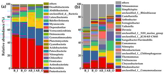 Figure 9b illustrates the microbial community structure at the genus level. The dominant genera of B_I and B_O include Rhodanobacter, Chryseobacterium, Trichococcus, and Nitrospira, while the main dominant genera of AB_I and AB_O include Chryseobacterium, Trichococcus, Thermomonas, and Microbacterium.