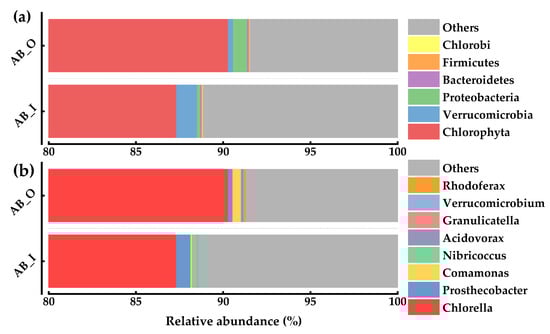 Relative abundance of algal community: (a) phylum level; (b) genus level.