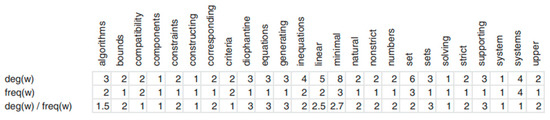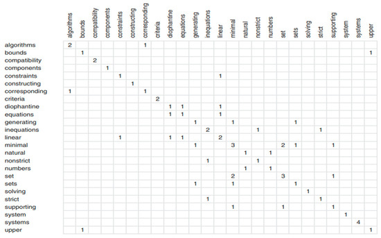 Jones and Paytner [31] developed a system that lists documents related to keywords and hyperlink keyword links between documents, allowing users to access content quickly. Similarly, Gutwin and Paytner [32] developed a system for identifying keywords in a copy. They enriched the presentation results with keywords. Keywords can be extracted with the statistical evaluation of the texts in the document. This is performed by comparing word frequency distributions in a text with distributions in a reference corpus. Selecting statistically distinctive words for an index dictionary has positive results [33]. Some keywords are unlikely to be statistically outstanding in the corpus. Word combinations may need to be considered when statistically corpus building. A syntactic filter should be used to select keywords; words frequently repeated but meaningless should be excluded [34]. Once possible keywords have been identified, keyword associations should be revealed. The relationships of possible keywords can be shown graphically or with matrix tables. Keywords are determined by calculating the frequency of keywords in the document and the degree of association with other possible keywords. Software such as MAXQDA can process textual data, perform qualitative data analyses, and provide a linguistic approach by evaluating metrics for opinion extraction. It can organize and categorize unstructured data, search for information, test theories, and create illustrations [35]. Figure 2 and Figure 3 present the keyword association matrix and the possible keyword study identified by the researchers [30]. The numbers within the matrix indicate how many times the words co-occur. Based on the co-occurrence matrix, the probability of a word being a keyword is determined by dividing the frequencies of the words by the number of different words they co-occur with.